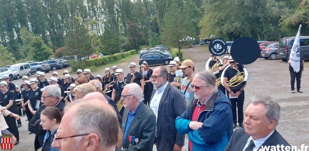 Après le dépôt de fleurs, la minute de silence et la Marseillaise jouée par la musique d’Eperlecques-Tournehem, Laurent Denis maire d’Eperlecques, Daniel Deschodt maire de Watten et Bertrand Petit conseiller départemental rappelèrent tour à tour la nécessité de faire perdurer le devoir de mémoire, tandis qu’une guerre se déroule encore au cœur de l’Europe.