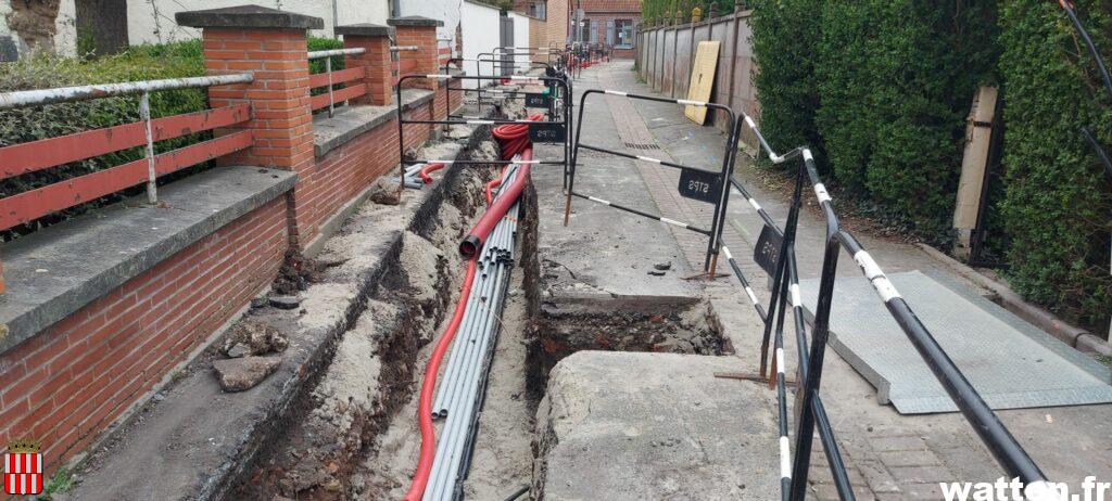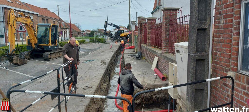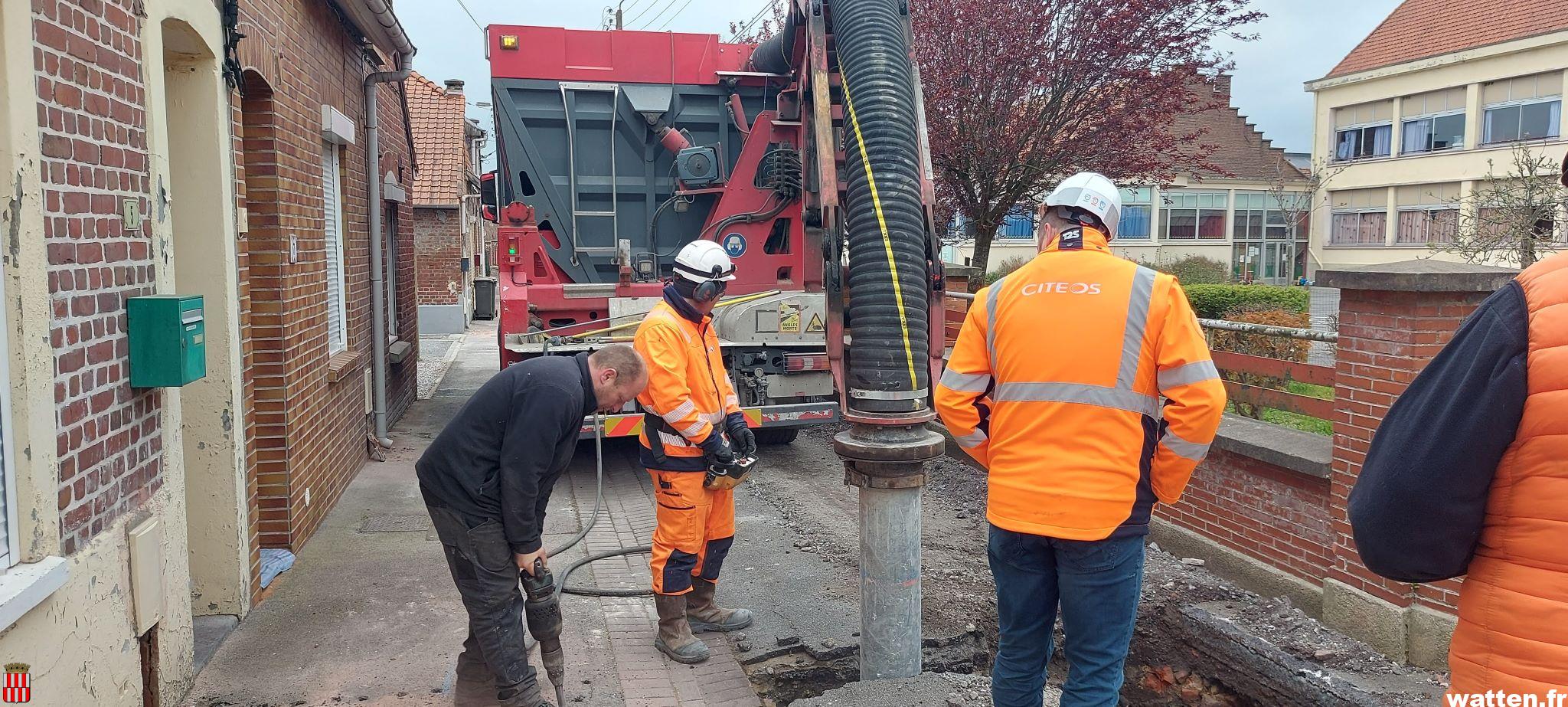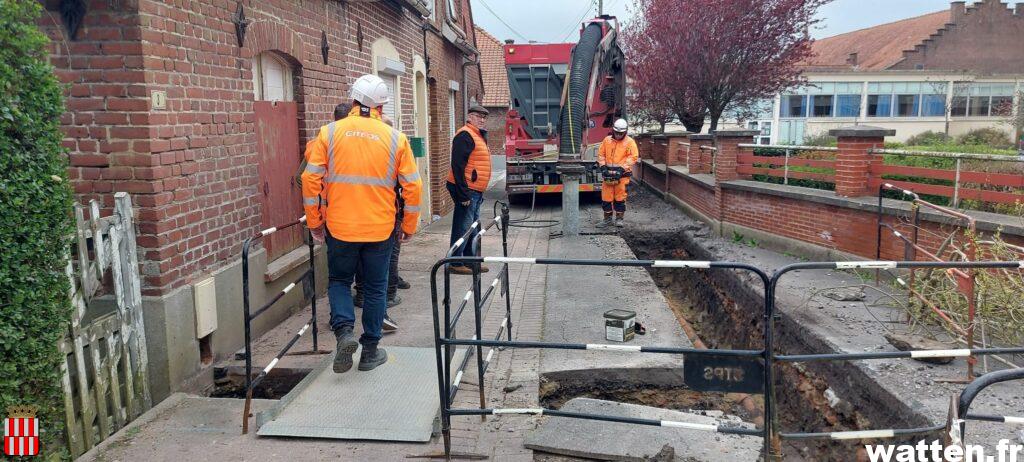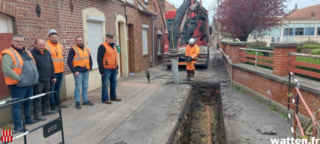 Chaque vendredi matin une réunion de chantier réunit les représentants de la mairie de Watten, le Territoire Energie Flandre qui assure la maîtrise d’œuvre, l’entreprise STPS qui assure les terrassements, et l’entreprise Citeos qui enfouit les câbles et prépare tous les branchements. A cette occasion tous les problèmes parfois rencontrés avec les riverains peuvent être résolus. Pour un chantier rapide, le terrassement se fait avec l’aide d’une impressionnante machine: un aspirateur géant et surpuissant qui permet d’évacuer tous les gravats sans grutage dans les voies étroites.