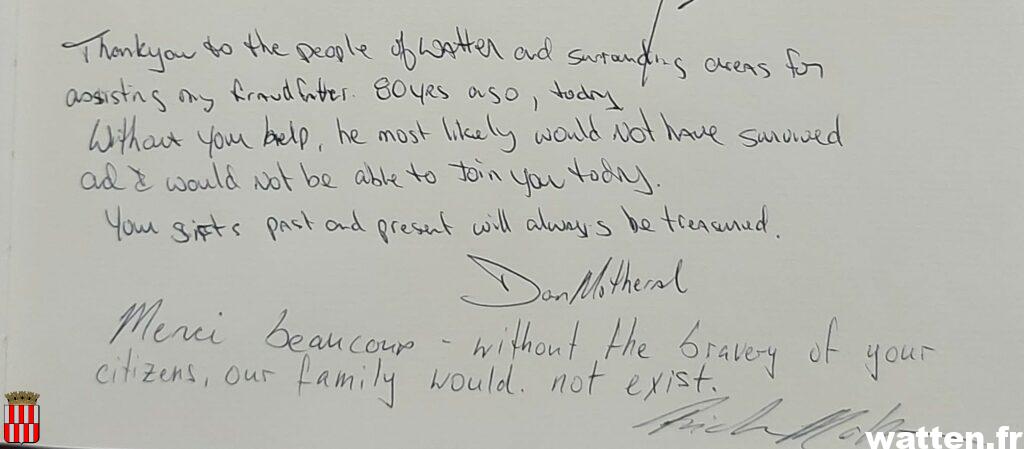 Des cadeaux furent offerts au couple canadien, notamment des photos de l’époque rassemblées par les Amis du Vieux Watten dont une délégation était présente. Le président de l’association Antiqu’air Jocelyn Leclercq, qui assurait la traduction, a également remis des souvenirs appréciés par Dan et Richela Motheral qui ont ensuite pu échanger avec l’assistance et signer le livre d’or de Watten.