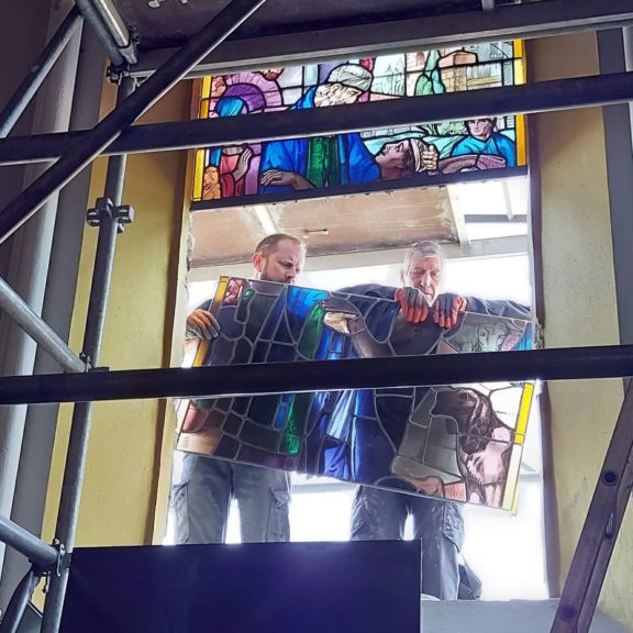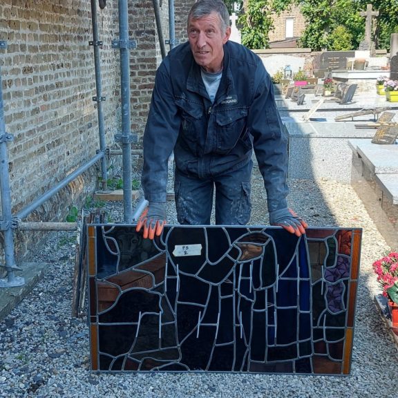 Ce mardi 5 avril une équipe de l’Atelier Brouard de Ronchin est venu procéder au démontage de deux vitraux de la nef latérale nord de l’église. En quelques heures les panneaux colorés ont été descellés et rangés dans des caisses spéciales, avec toutes les précautions d’usage. Des contreplaqués les ont remplacés.