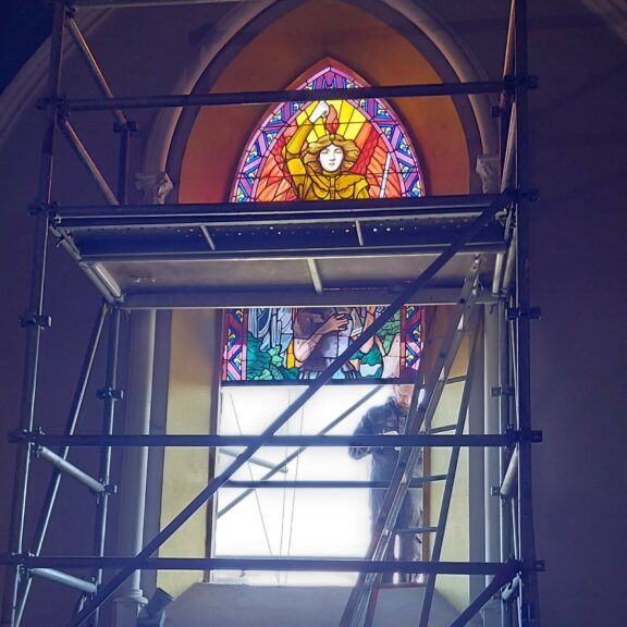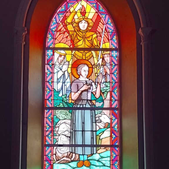 Le lundi matin 27 mars 2023 le vitrail représentant Jeanne d’Arc a repris sa place au bout de la nef nord de l’église.