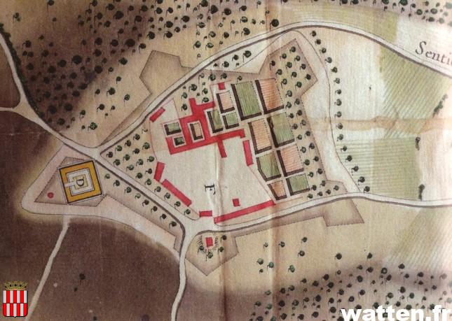 A l’intérieur du fort, de nombreux bâtiments ont été construits autour du monastère, pour servir de logement aux garnisons présentes et pour stocker vivres et munitions. Sur une gravure de Watten réalisée au XVIIe siècle, on peut voir le bourg de Watten au pied du fort, avec un moulin en bois et les bâtiments du collège des jésuites anglais, entourés de fortifications en terre. Pendant deux ans, Watten et les forts de Mardyck et de Lynck, constituent une ligne de défense locale. Cette ligne se prolonge de Saint-Omer jusqu’à Gravelines et la mer. En 1646, le fort est abandonné, d’abord à cause de difficultés sanitaires, puis par déplacement de la ligne de front. Le roi Louis XIV lance un ordre de démolition en juin 1646, qui ne sera pas appliqué en totalité : seul le canon sera déplacé à Calais. En 1647, Watten retombe aux mains des Espagnols qui eux détruisent les fortifications en 1650. La position sera réoccupée plus tard par Turenne en 1657, par le gouverneur d’Artois en 1676, et par les Français en 1677. Les fortifications en terre bénéficient d’une «remise à neuf». En 1678, Watten devient définitivement française. (Illustration: le fort de Watten, 1742, SHAT)