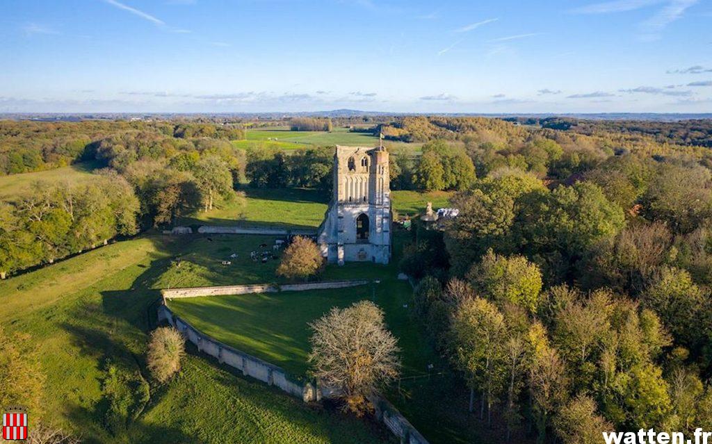 Vers 1045, sur les ruines romaines situées au sommet du mont, le moine Alphume fit ériger une chapelle dédiée à saint Riquier. Quelques années plus tard, en 1072, le prêtre Olfride y fonda l’abbaye de Watten avec des moines qui provenaient du monastère de Saint-Gilles près de Liège. L’abbaye fut consacrée en 1097 sous le vocable de « Notre-Dame du Mont de Watten » et fut richement dotée par les comtes de Flandre. Le monastère, construit dans le style roman, obéissait à la règle saint Augustin. C’est autour de l’abbaye, et de la maison dite des jésuites anglais, que s’est établie au XVIIe siècle la fortification principale, maîtrisant ainsi la route de Cassel. Faire demi-tour et descendre par le même sentier.