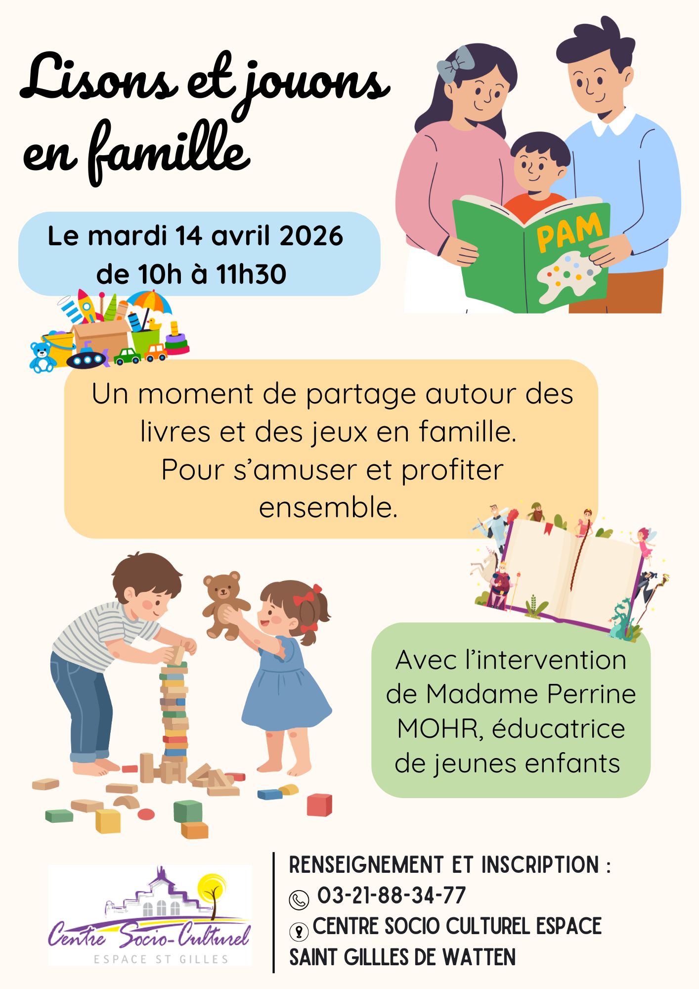 Le 14 avril de 10h à 11h30 atelier Lisons et jouons en famille au Centre socio-culturel!