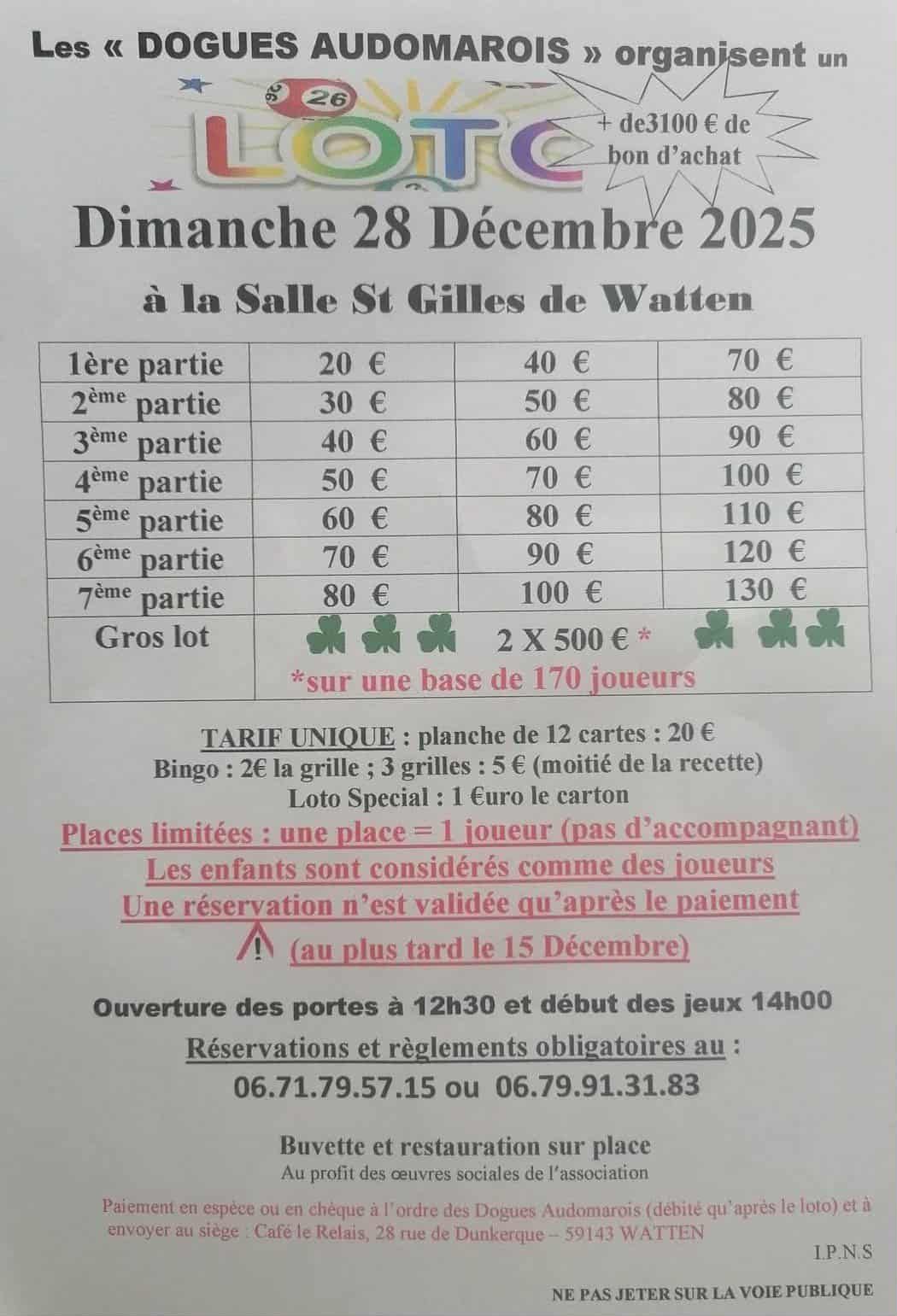 Le prochain loto des Dogues Audomarois aura lieu le 28 décembre 2025 (ouverture des portes à 12h30).