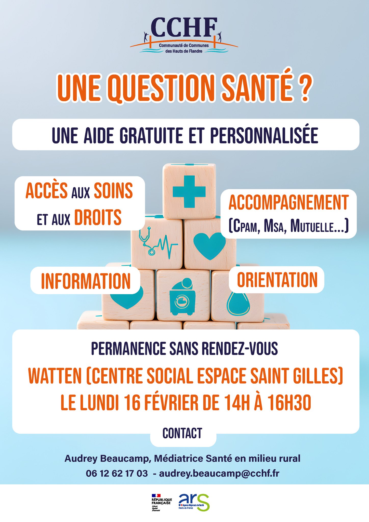 La Communauté de Communes des Hauts de Flandre (CCHF) propose une permanence santé sans rendez-vous pour répondre à toutes vos questions concernant l’accès aux soins, vos droits, l’accompagnement (CPAM, mutuelle…), l’information et l’orientation.