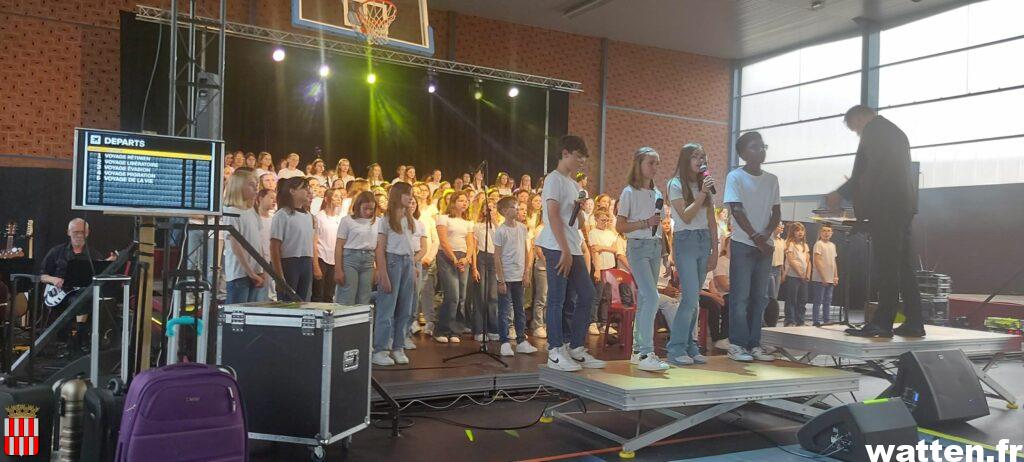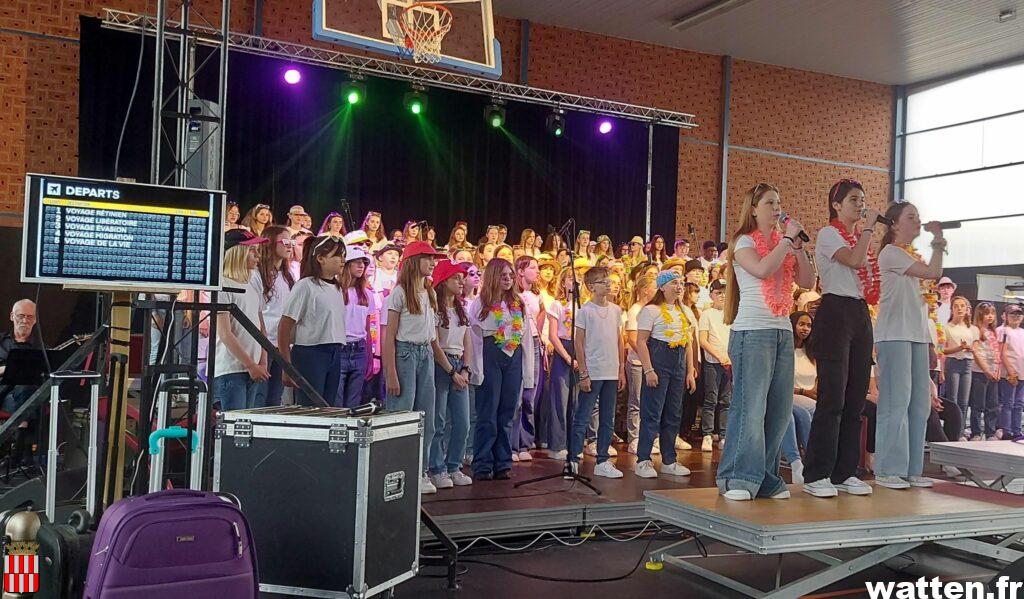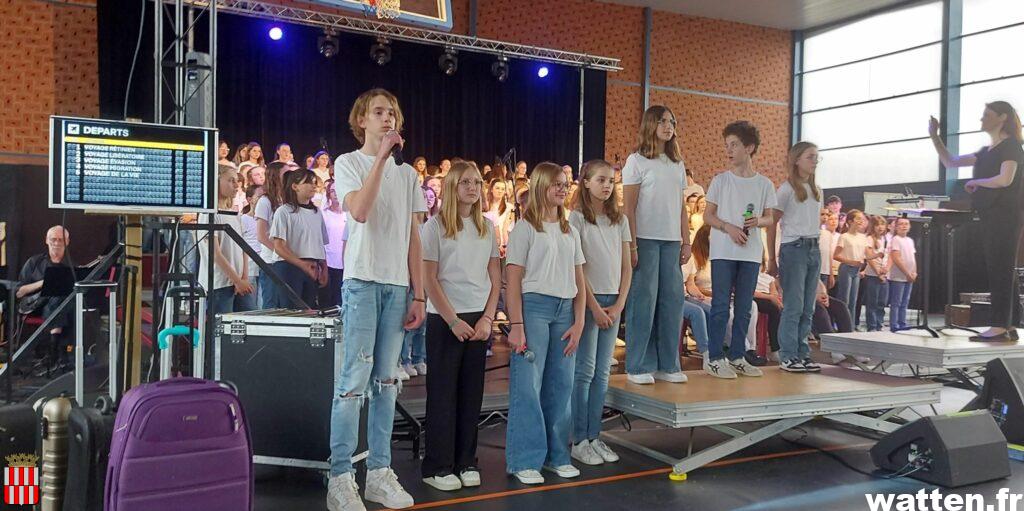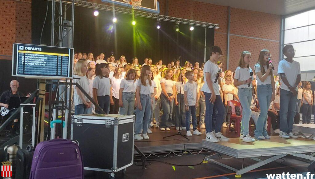 Ce mardi 21 mai la salle des sports Harlay a accueilli les chorales des collèges Jacques Prévert de Watten, les Dentellières de Calais, du Looweg de Crochte, les Argousiers de Oye-Plage, dans le cadre du programme Vocali. Un travail d’acteurs et de plasticiens a ponctué ce spectacle musical intitulé « Voyages Voyages »