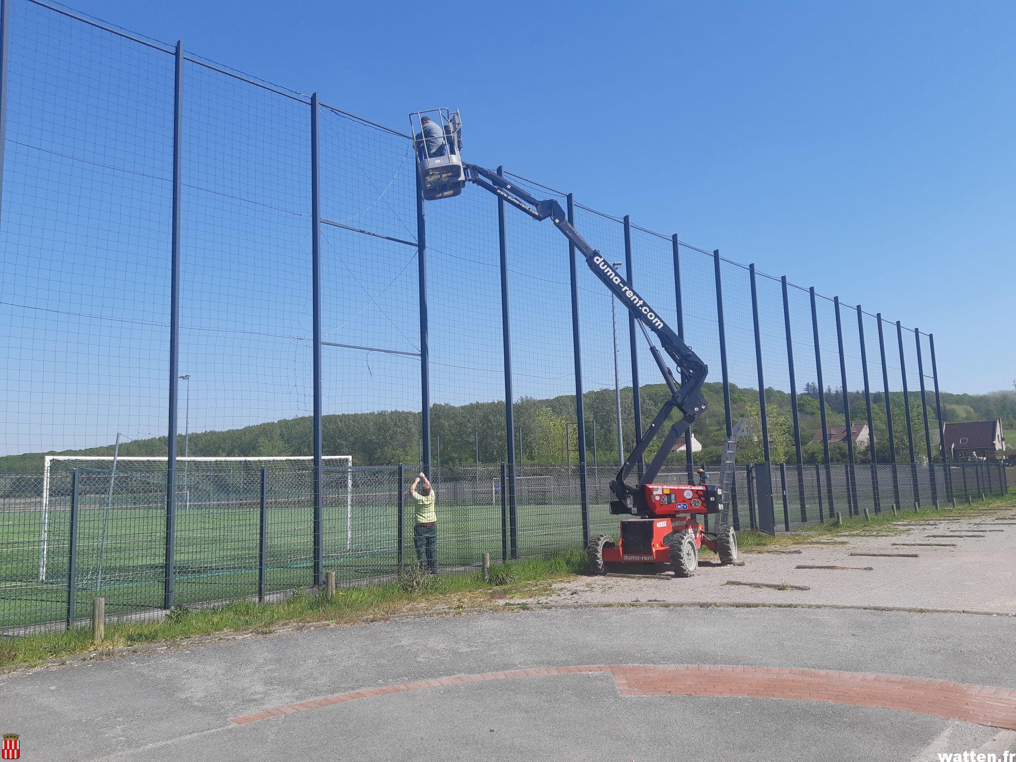 Réparation des filets pare-ballons du stade Decreton par le personnel communal avec du matériel adapté et sécurisé