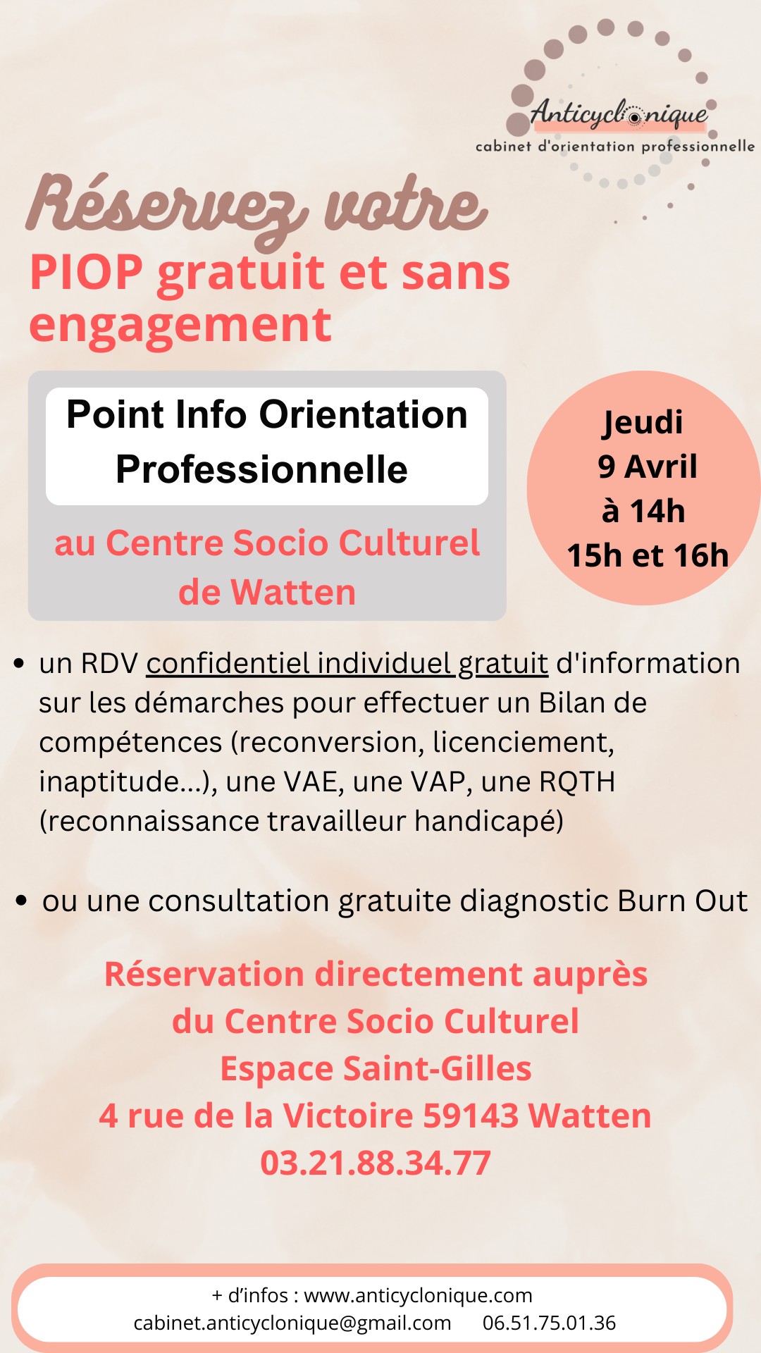Le jeudi 9 avril à 14h00, 15h00 et 16h00 au Centre socio-culturel, un rendez-vous GRATUIT individuel d’information sur les démarches pour effectuer un Bilan de compétences:
