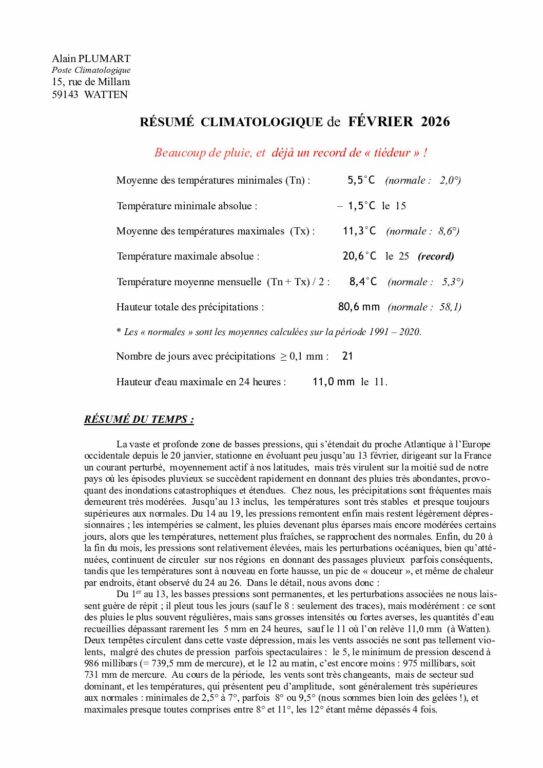 Résumé climatologique de février 2026 à Watten