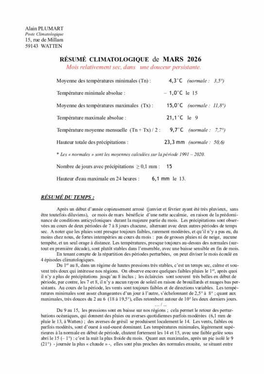 Résumé climatologique de mars 2026 à Watten