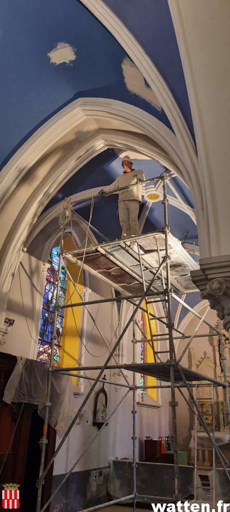 Ce lundi 15 mars l’entreprise Staff Courtenay, de Pont-à-Marcq, a remplacé un cordon de plâtre dans le chœur de l’église. Dans un deuxième temps elle travaillera sur les trous causés par les infiltrations, et les chutes de plâtras dans les voûtes. Mais pour cela, il faudra attendre que les nouvelles ardoises soit reposées. Ces travaux subventionnés par le plan de relance ADVB du Conseil Départemental du Nord devaient démarrer avant le 31 mars.