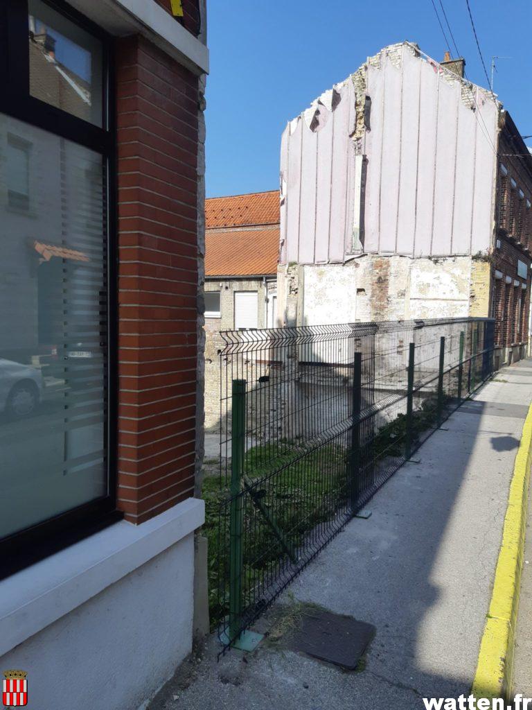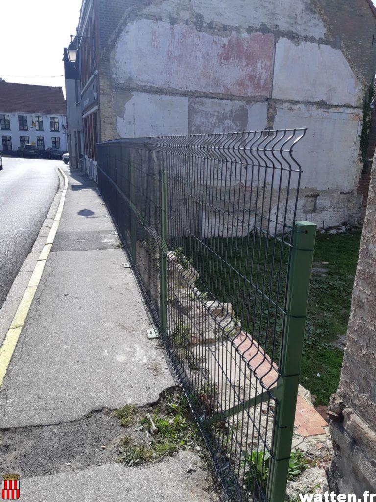 Pose d’un nouveau grillage rue des alliés à l’emplacement de l’ancienne mairie, en attendant le futur projet de construction, afin d’assurer de meilleures conditions de sécurité pour les piétons.