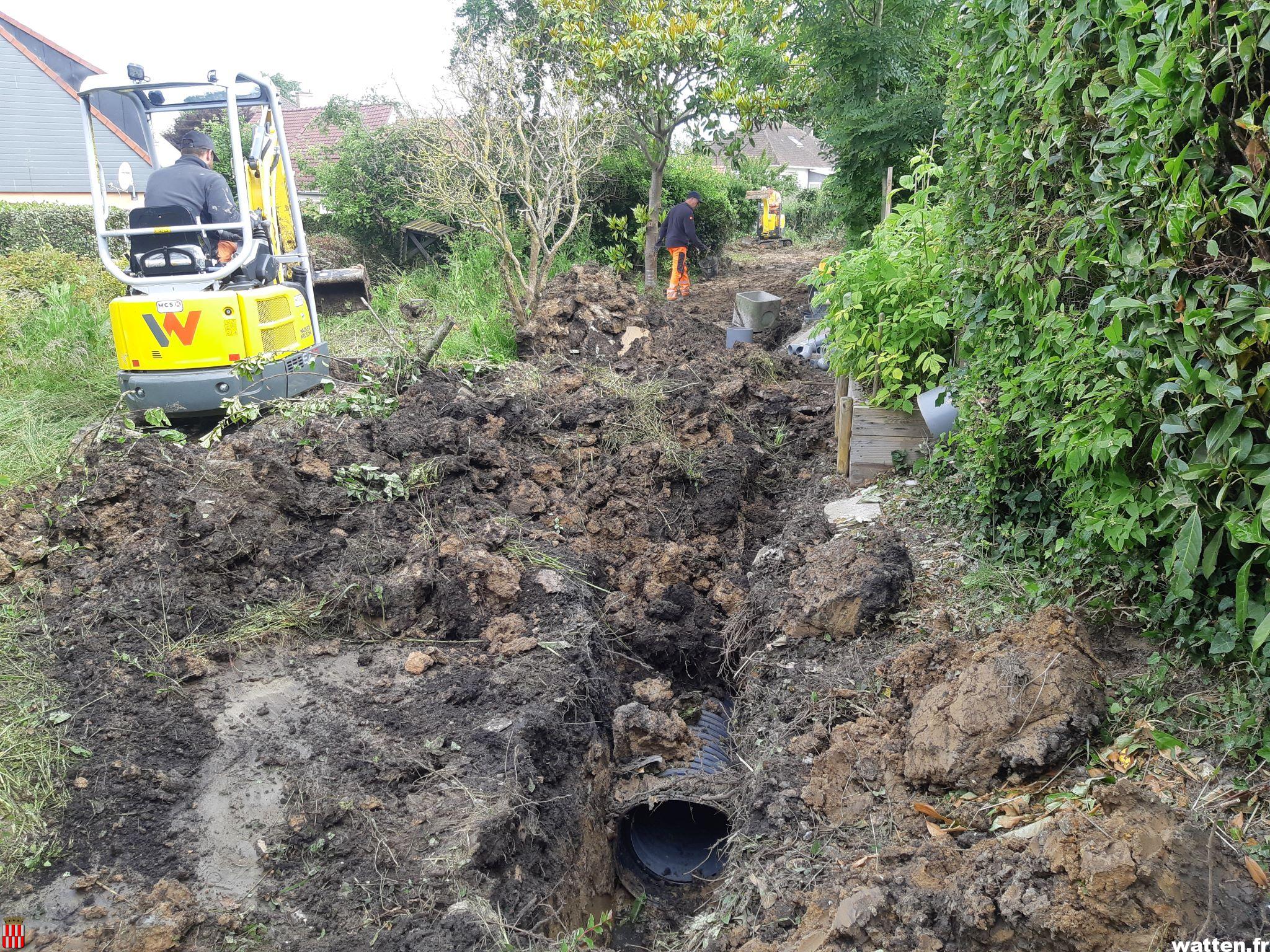 Pose d’un gros drain d’évacuation des eaux de ruissellement derrière les maisons de la rue des Marguerites par le propriétaire du terrain Flandre Opale Habitat.