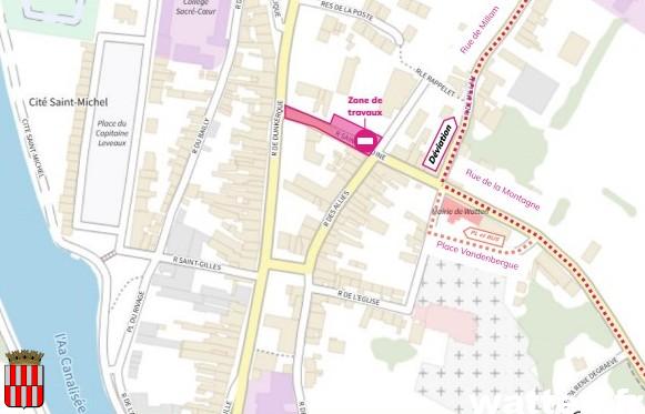 Pendant les travaux au 10 rue Saint-Antoine du 20 au 30 avril 2026 et du 13 au 29 mai 2026, la circulation en descendant de la rue de la Montagne sera déviée par la rue de Millam (et par la place Vandenbergue pour les bus et poids lourds).
