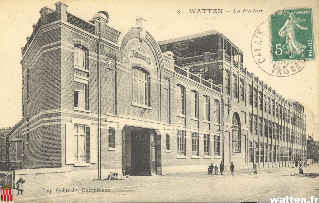 La filature Vandesmet apportera travail et prospérité à la ville jusqu’à la crise économique et la fermeture définitive en 1977. Issu d’une famille de cordiers établie à Saint-Omer depuis le XVIIe siècle, exploitant la filature au moulin Platiau à Blendecques, Adolphe Vandesmet fonde en 1852 à Watten, rue de l’Ermitage, une filature pour filer les étoupes de lin. Adolphe Antoine Aimable Vandesmet (04 août 1817 – 09 novembre 1898) épouse Philippine Flore De Capol (1822-1888). Ils auront cinq enfants: Adolphe, Félix, Laure, Gustave, et Gaston. Félix et Gustave partiront au Brésil où ils s’investiront dans l’industrie sucrière (la branche brésilienne existe toujours). Adolphe l’aîné et Gastion le cadet prennent la succession de leur père en 1876. Adolphe Vandesmet épouse Alice Lemaire, et ils auront quatre enfants: Valentine, Thérèse, Fanny et Adolphe. Gaston Vandesmet épouse en premières noces Marguerite Lemaire, et ils auront aussi quatre enfants: Yvonne, Paul, Madeleine, Marguerite-Marie, et en deuxièmes noces Jeanne De Capol, avec qui il aura trois enfants: Jean, Henry, et Gaston.