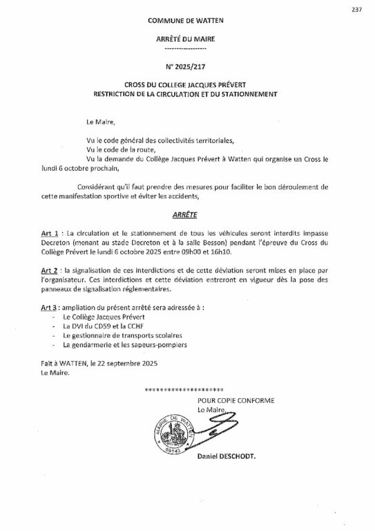 2025-217 arrêté du 22-09-2025 restriction circulation Cross collège Prévert