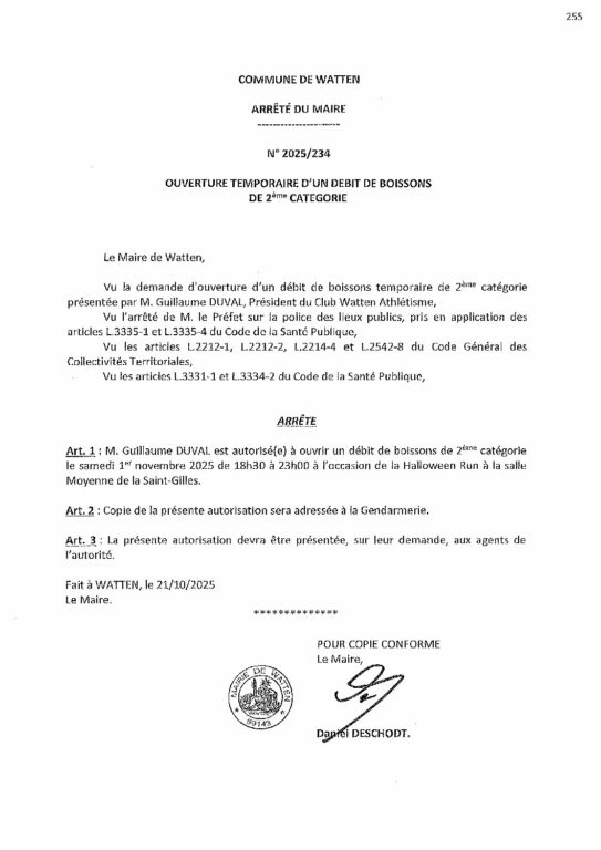 2025-234 arrêté du 21-10-2025 débit de boissons Halloween Run Watten Athlétisme