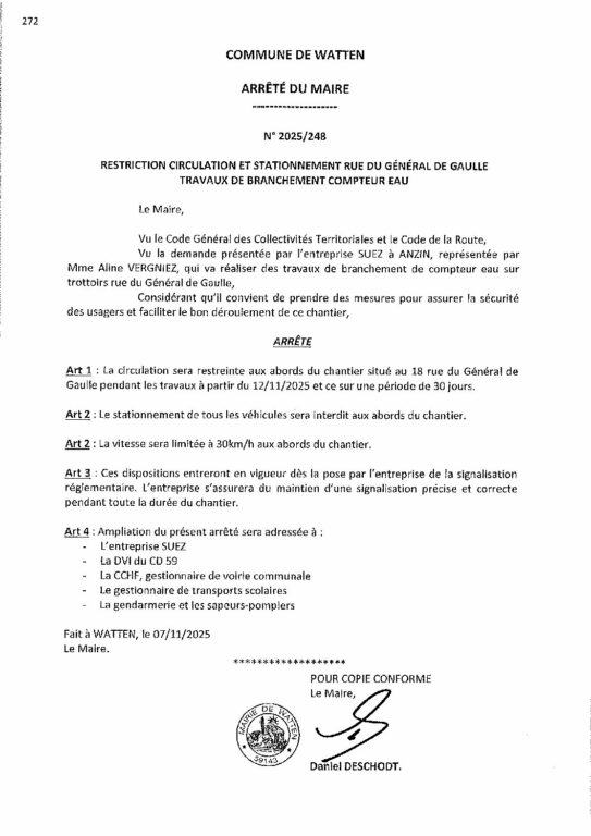 2025-248 arrêté du 07-11-2025 travaux branchement compteur eau rue du G. de Gaulle