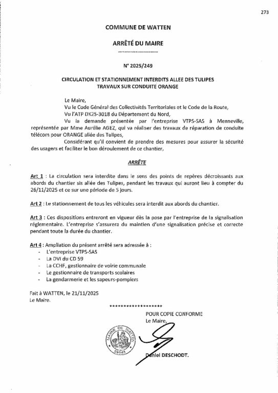 2025-249 arrêté du 21-11-2025 travaux conduite orange allée des Tulipes