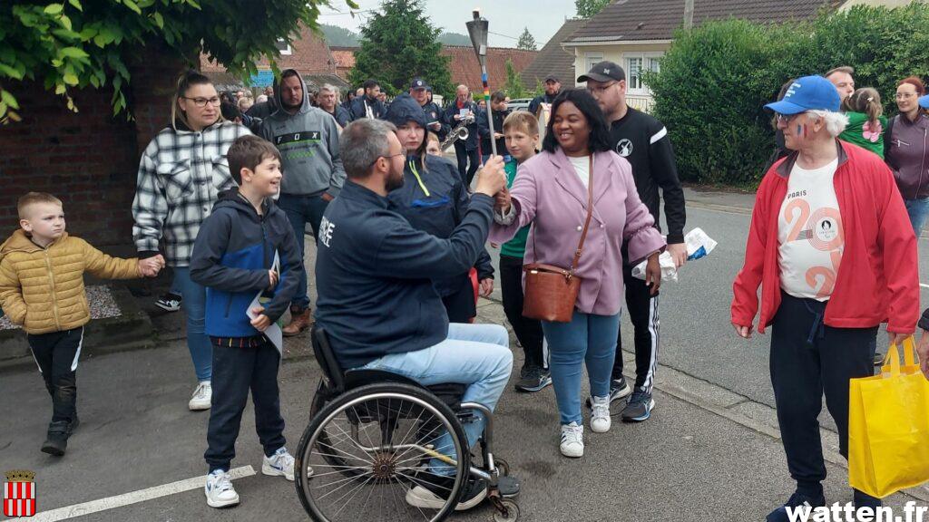 Malgré le vent une flamme presque olympique n’a pas cessé de brûler sur le stade. En fin d’après-midi elle a parcouru plusieurs rues de Watten sous la conduite de musiciens de l’Orchestre d’Harmonie. Une demi-douzaine de porteurs se sont relayés jusque la mairie, où le président de l’Union commerciale Daniel Deschodt s’est félicité de l’ambiance festive qui aura marqué cette après-midi. Il a ensuite remis le flambeau à l’Union Commerciale de Bollezeele représentée par Patricia et José Maeght. A charge pour eux d’assurer la transmission de la flamme!